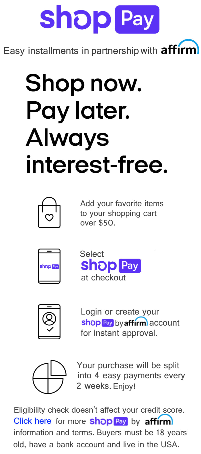 Pay in 4: when you choose Shop Pay installments at checkout, you can split your purchase into 0% interest 4 installment payments—with no additional, hidden, or late fees.